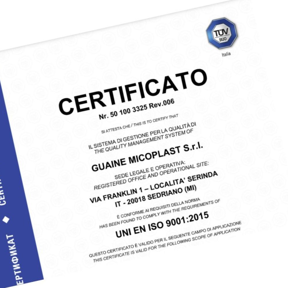 Guaine Micoplast ha conseguito la certificazione ISO 9001 relativamente al proprio intero processo di lavoro, a dimostrazione dell’attenzione alla qualità totale del servizio estesa anche ai rapporti con i fornitori. Con un controllo annuale da parte dell’Ente Certificatore, questo significa che ci impegniamo – e che vincoliamo i nostri partner commerciali –